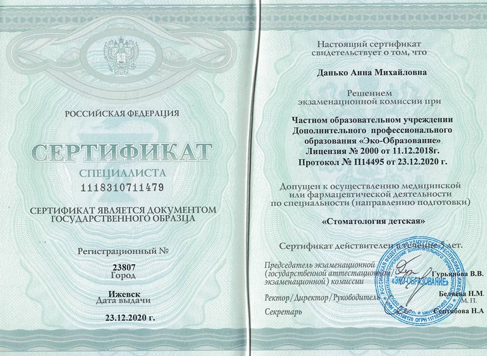 - 2020 Учебный центр «Эко-образование». Стоматология детская. Повышение квалификации