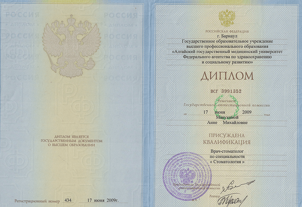 - 2009 Алтайский государственный медицинский университет. Стоматология. Базовое образование
