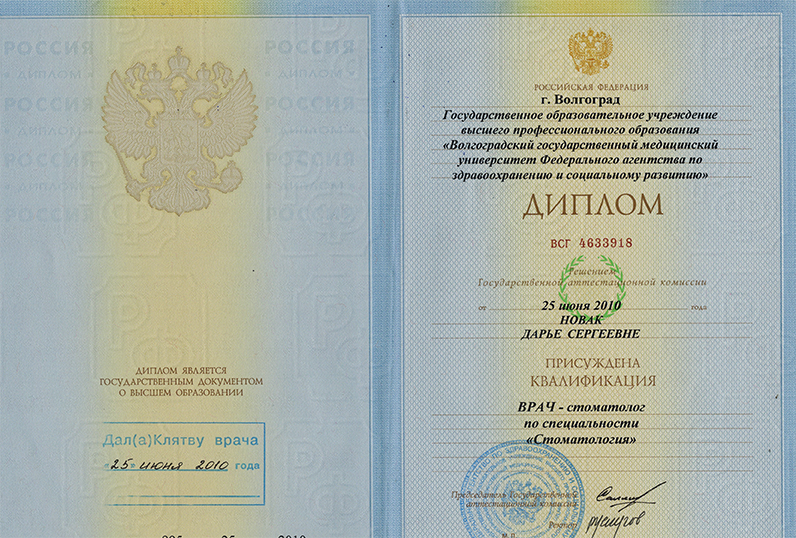 - 2010 Волгоградский государственный медицинский университет. Стоматология. Базовое образование